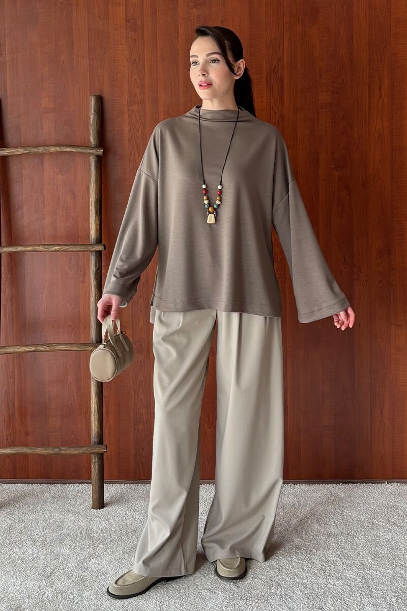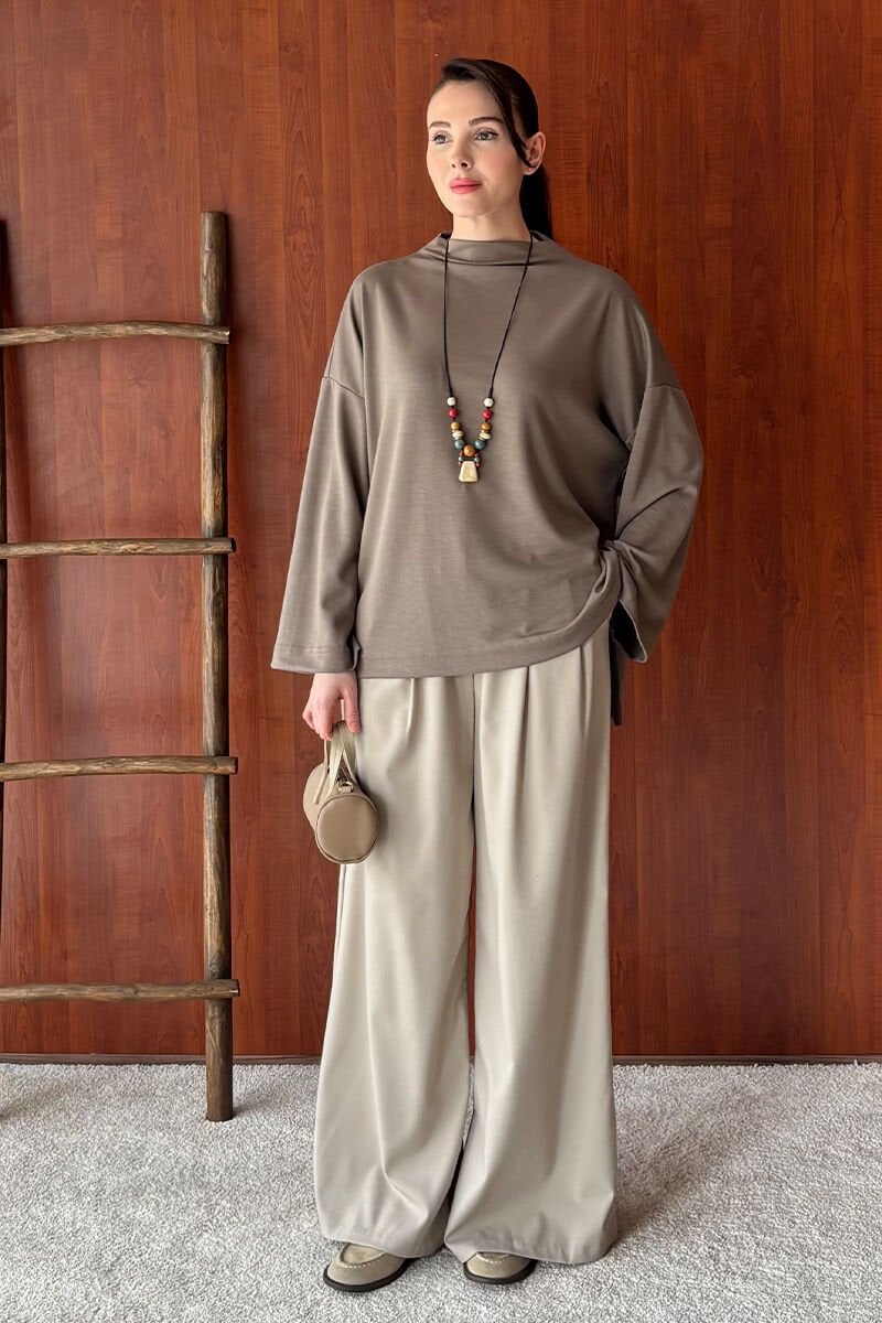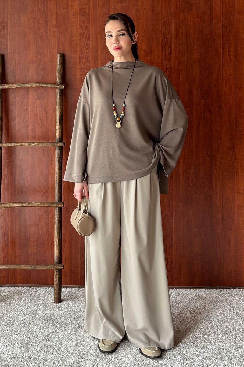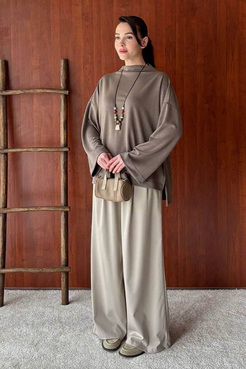 Vizon Oysho Dik Yaka Bluz & Vizon Pile Detay Palazzo Pantolon