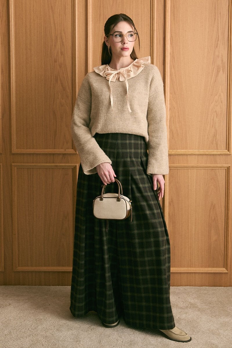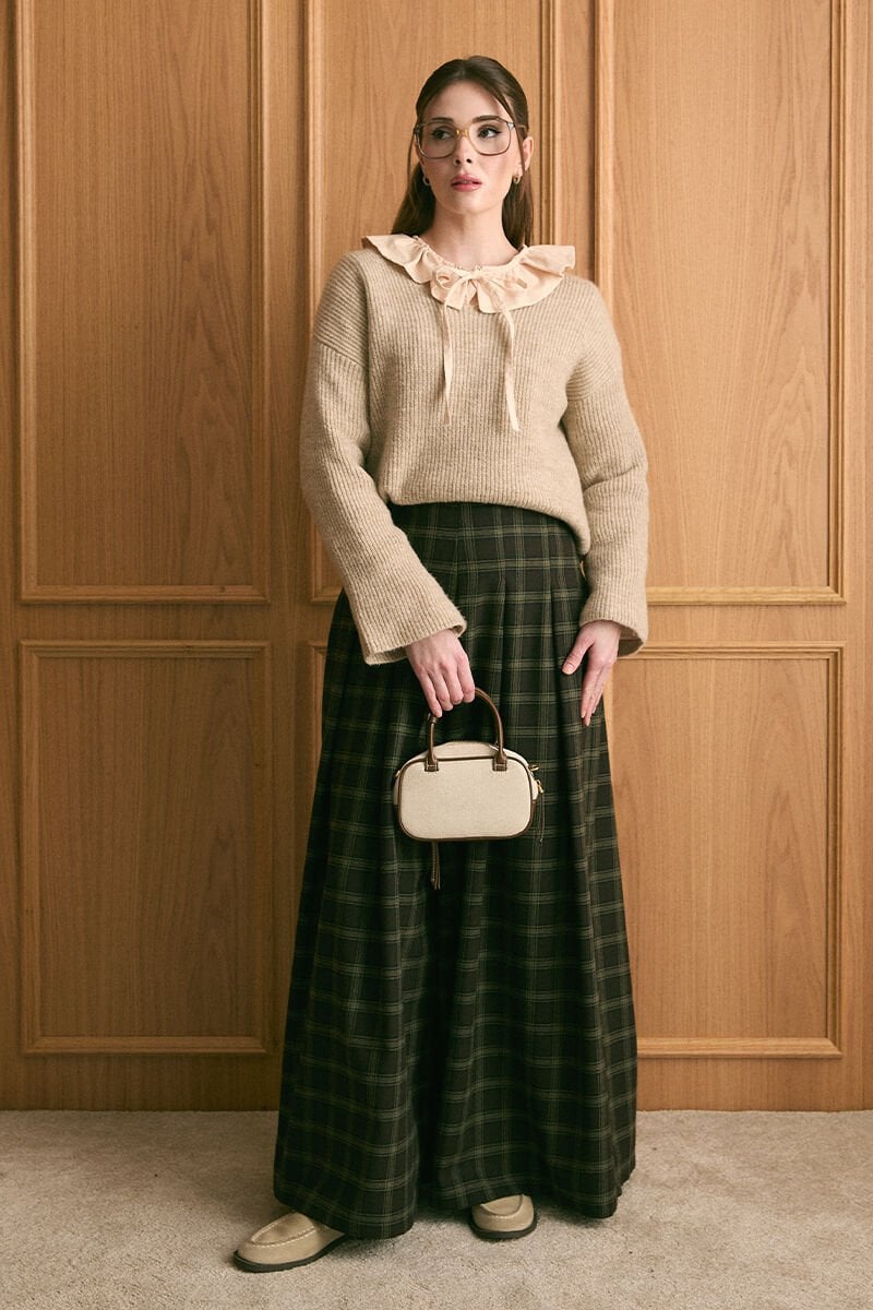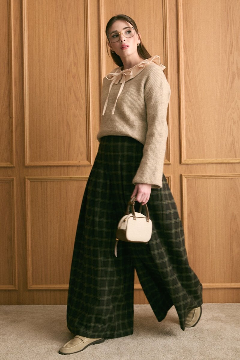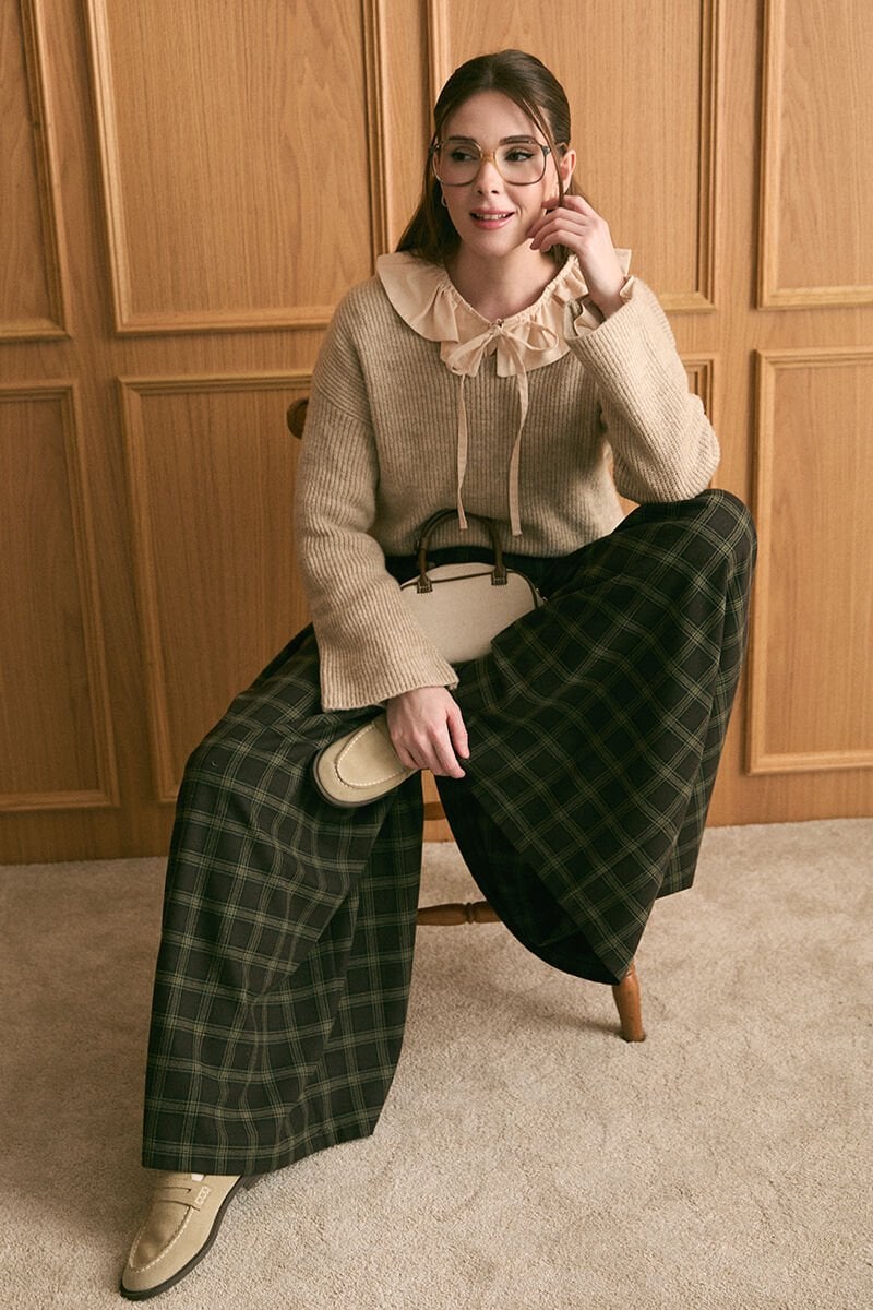 Vizon V Yaka Triko Kazak & Acı Kahve Ekose Pile Detay Bol Paça Pantolon Takım