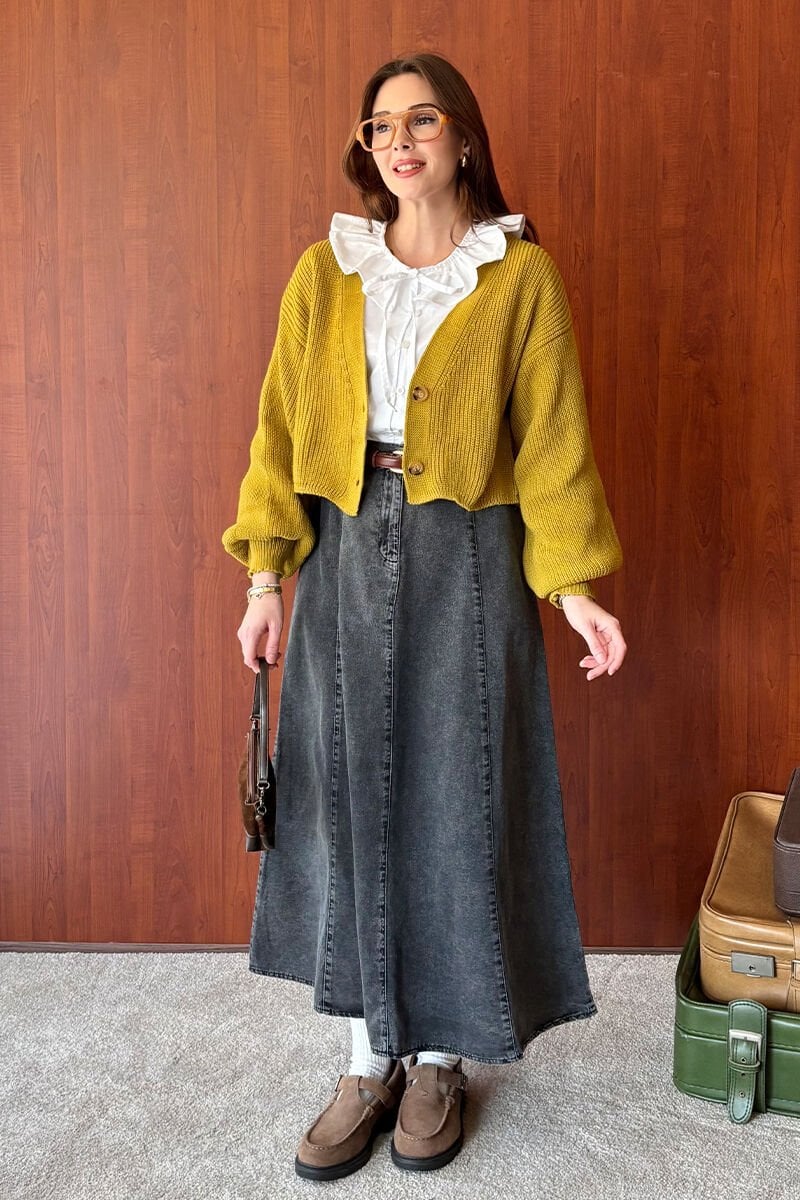 Yağ Yeşili Balon Kol Triko Hırka & Antrasit Kot Kloş Etek Takım