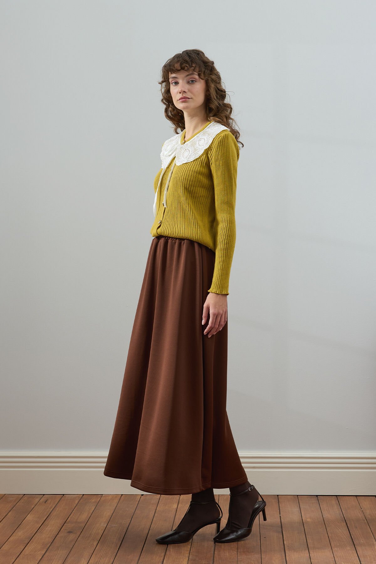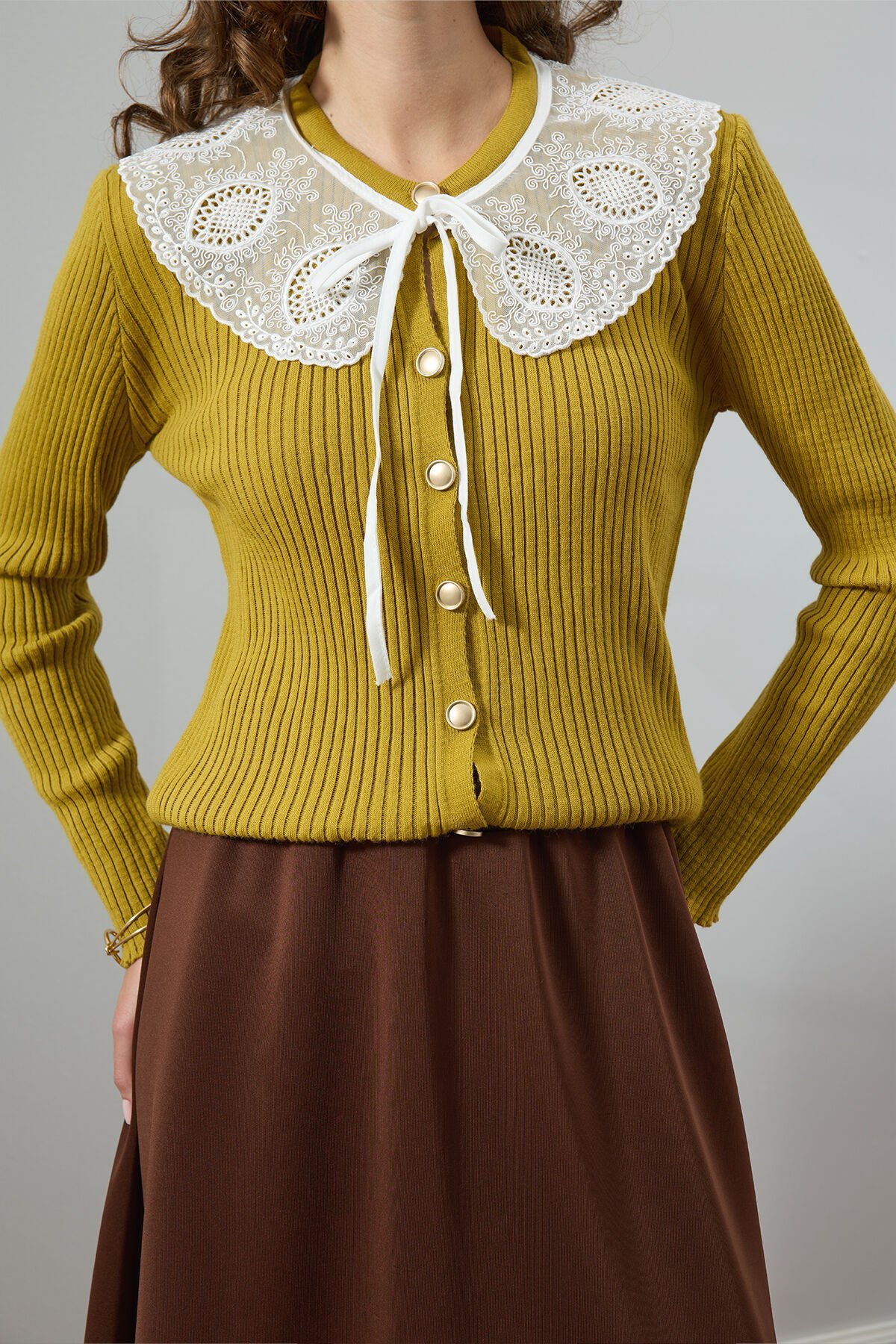 Yağ Yeşili Beyaz Yakalı Triko Hırka