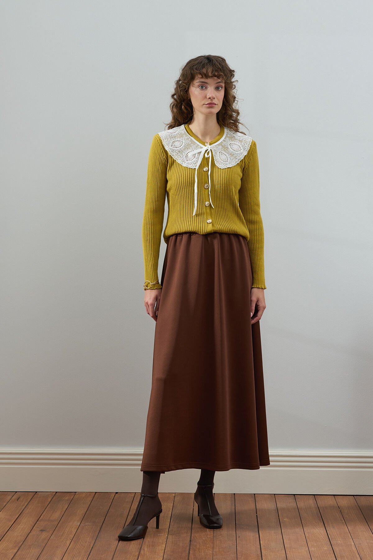 Yağ Yeşili Beyaz Yakalı Triko Hırka & Acı Kahve Scuba Etek Takım