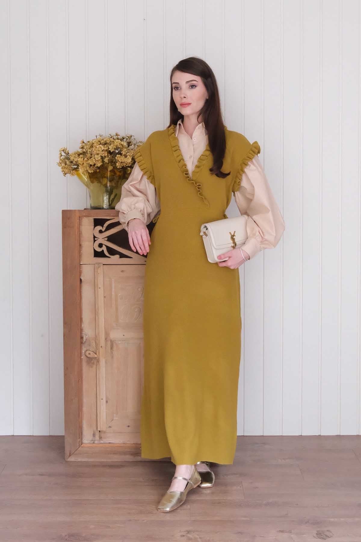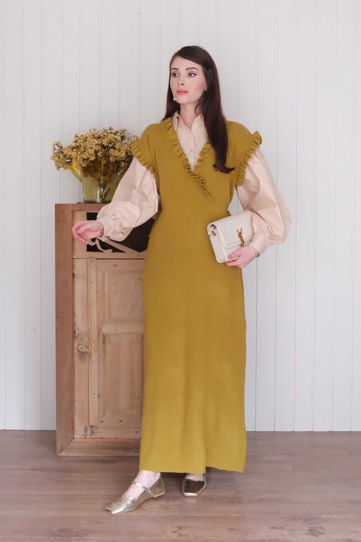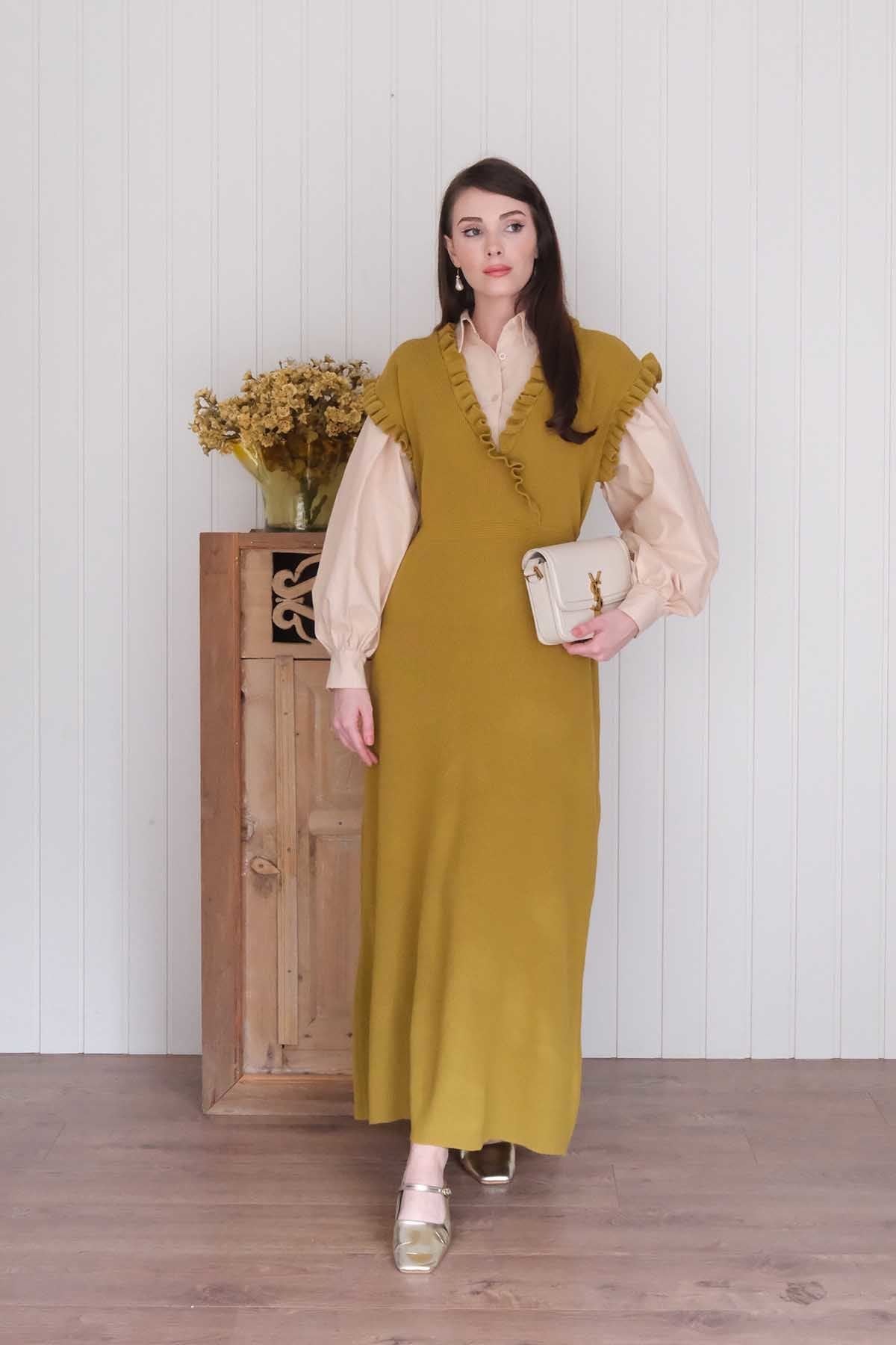 Bu fırfır yaka jile elbise, şıklığı ve rahatlığı bir arada sunan bir tasarıma sahiptir.