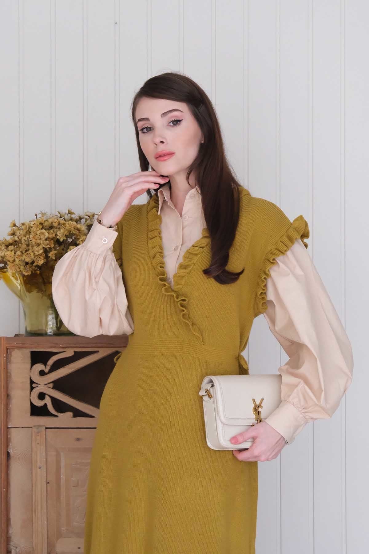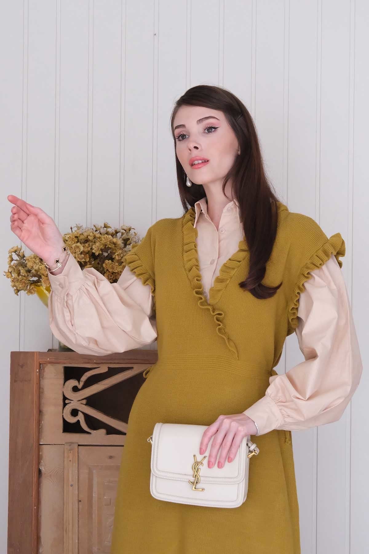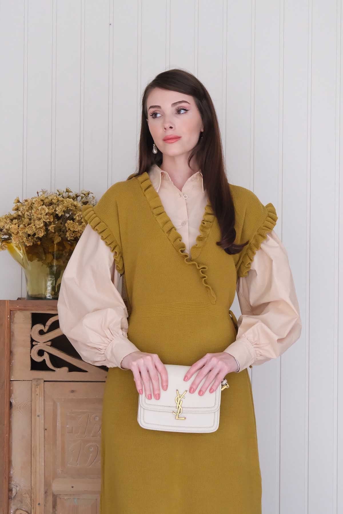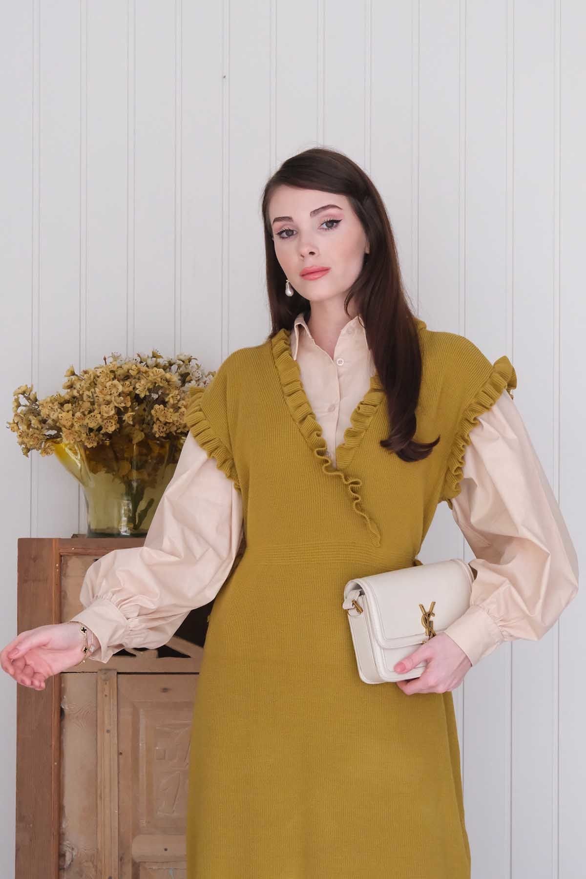 Bu fırfır yaka jile elbise, şıklığı ve rahatlığı bir arada sunan bir tasarıma sahiptir.