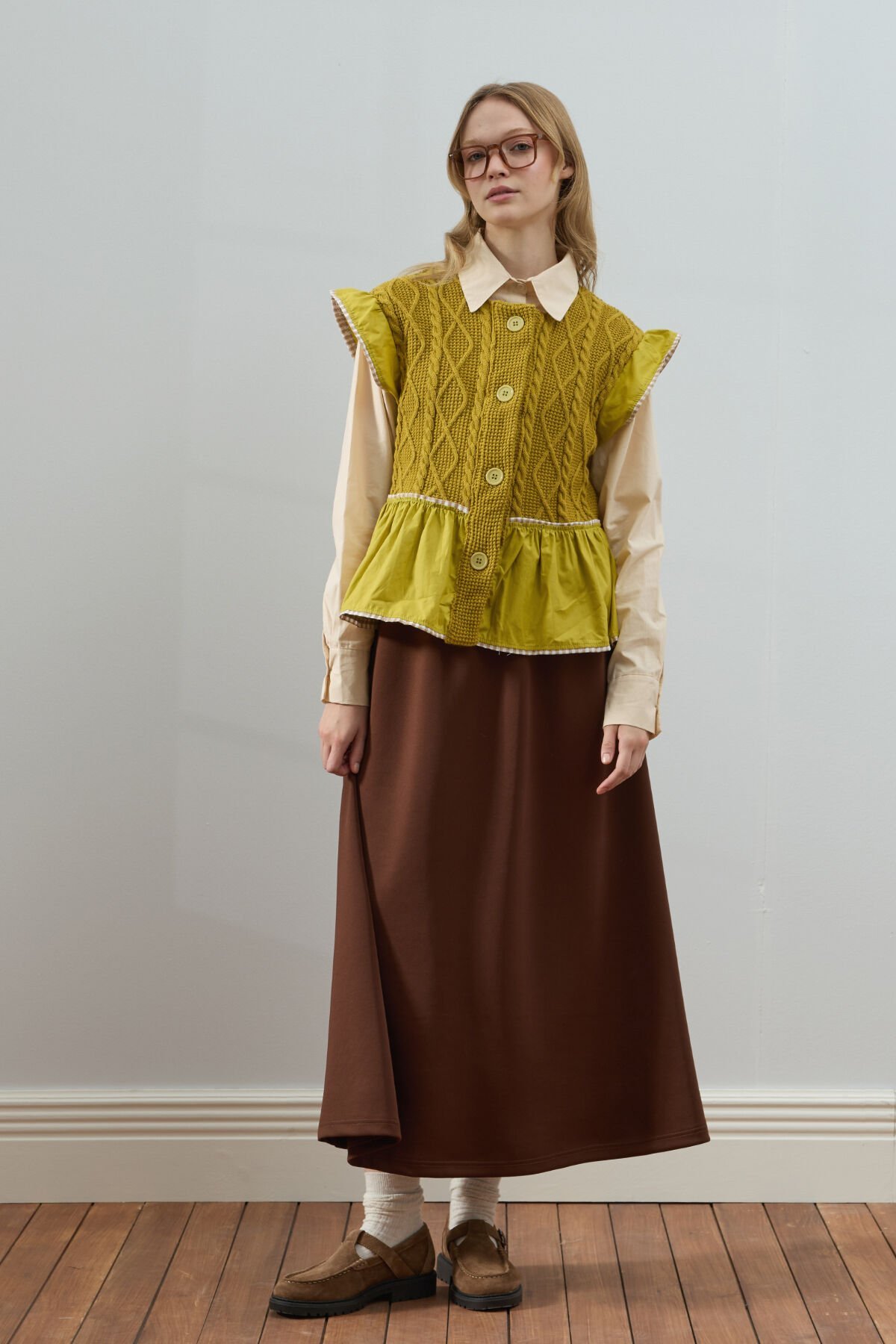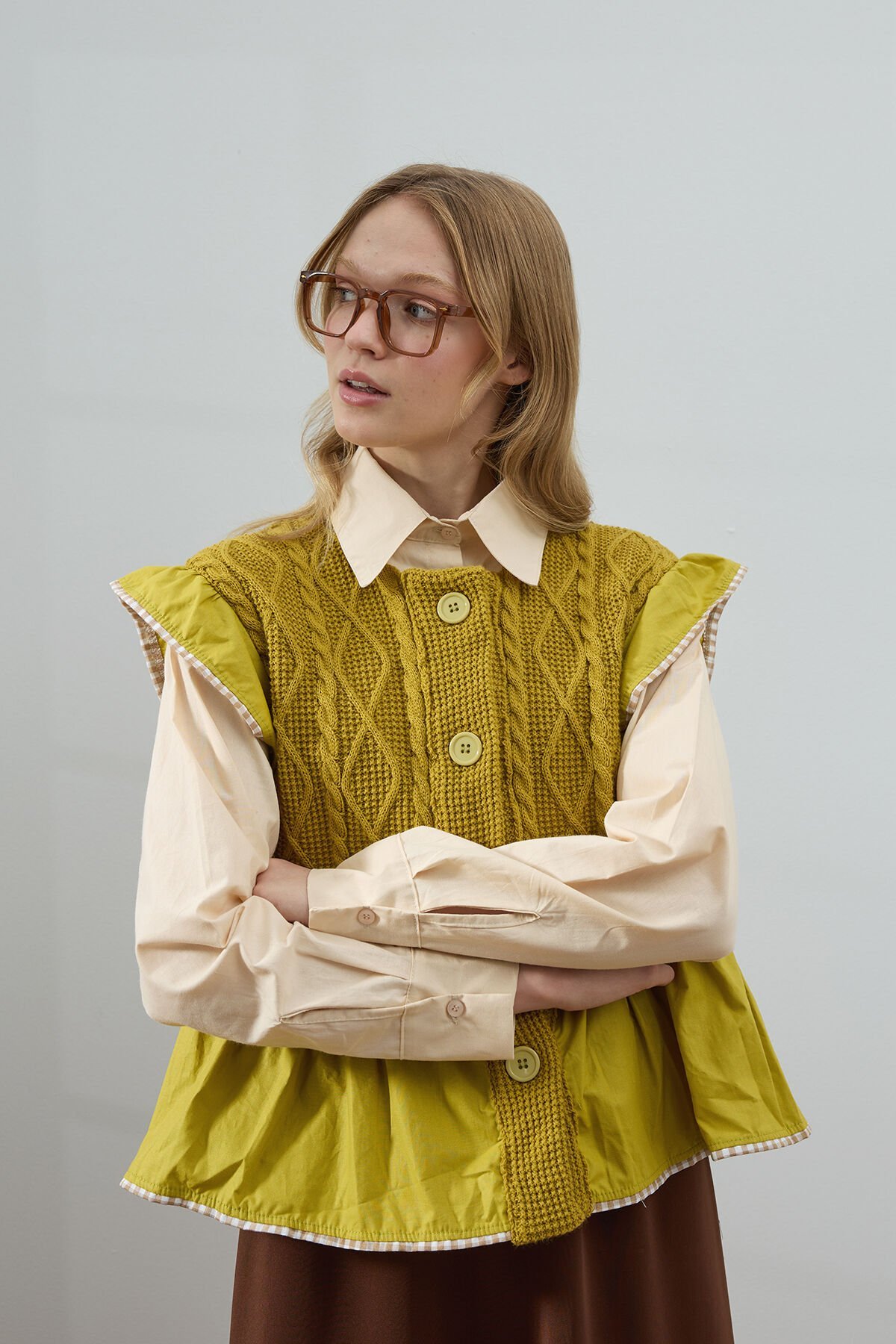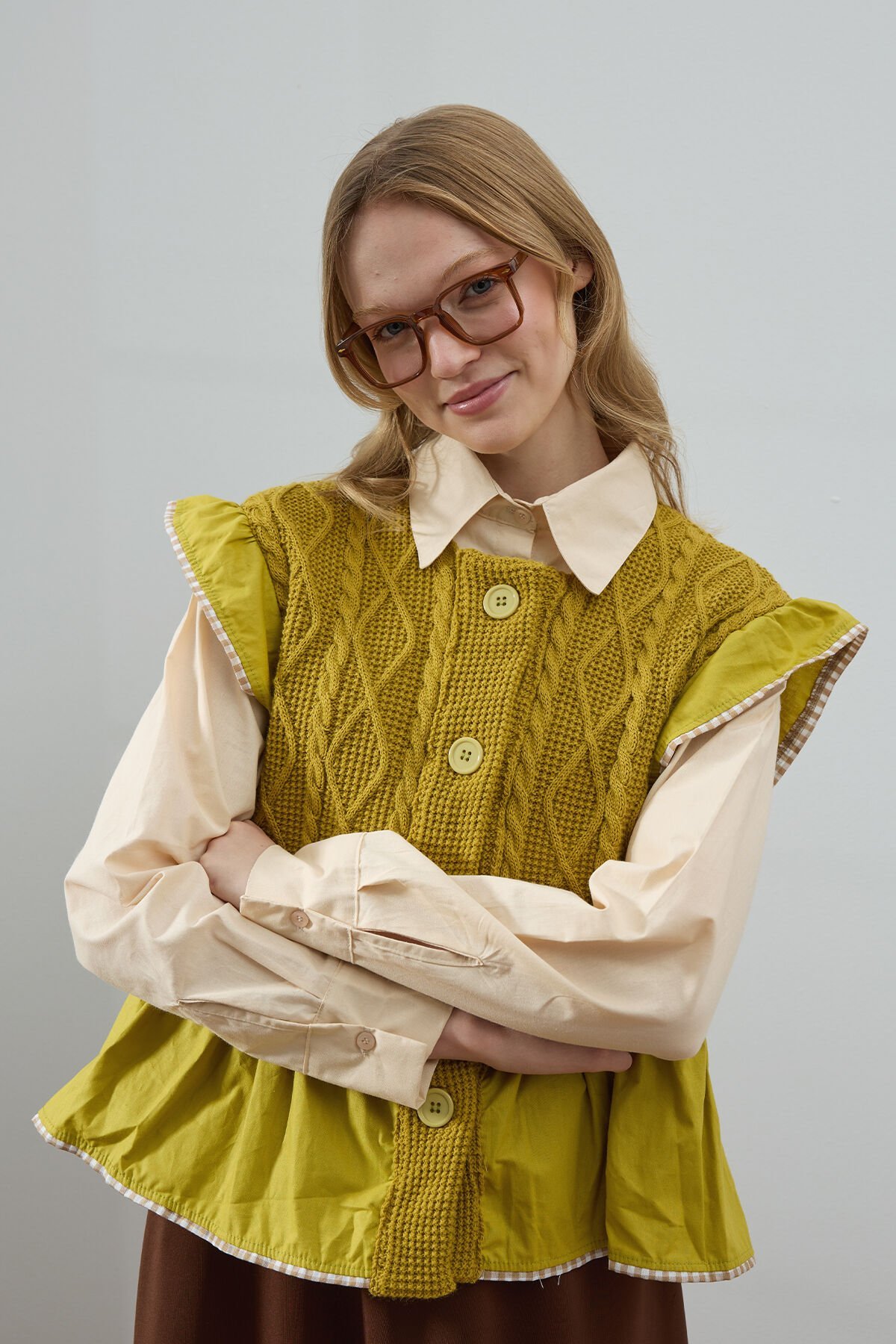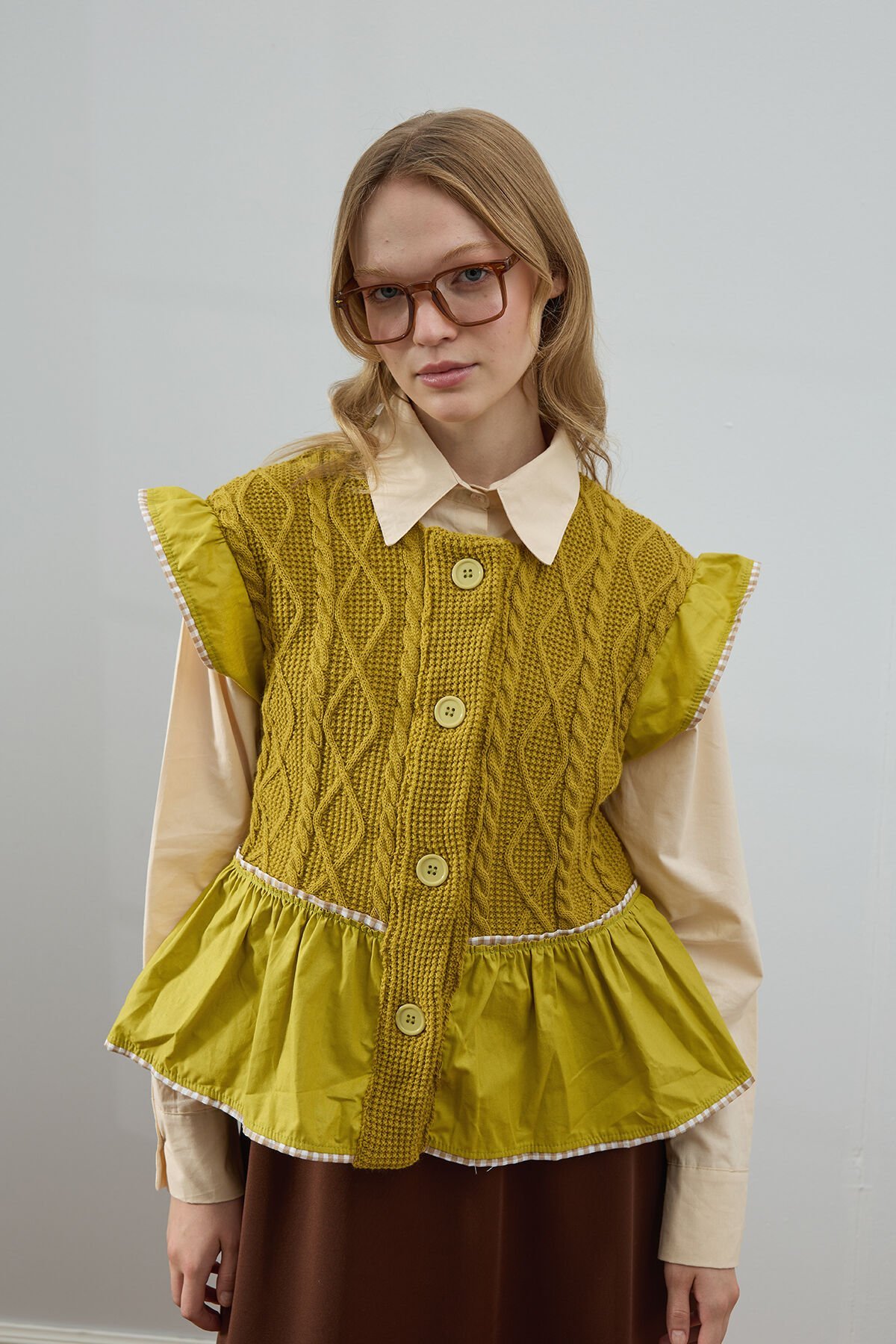 Bu fırfırlı triko yelek, hem şık hem de rahat bir görünüm sunar.