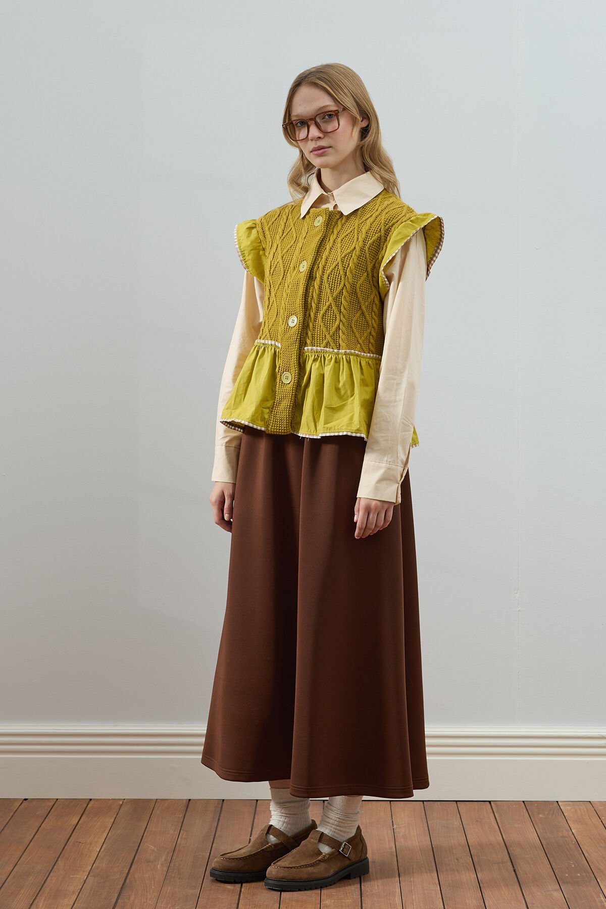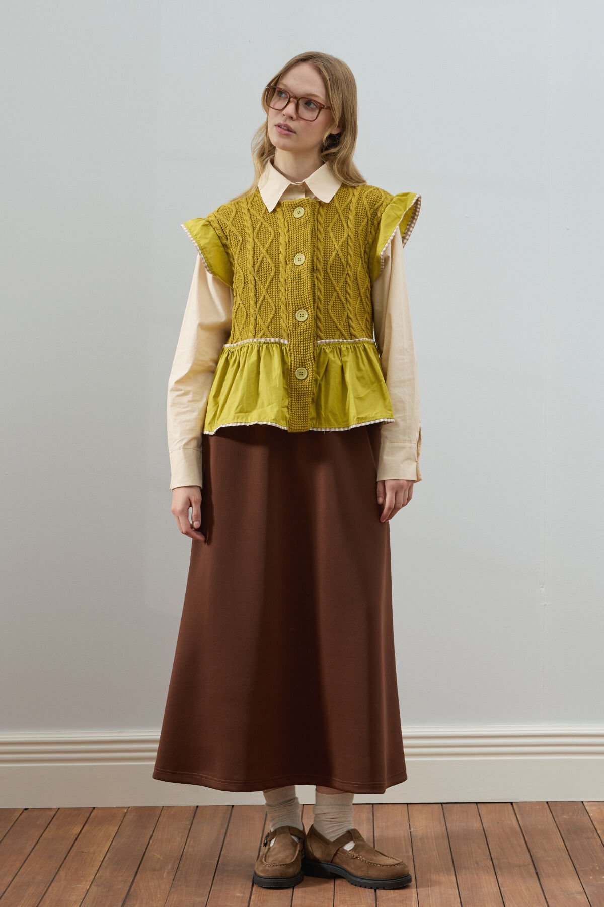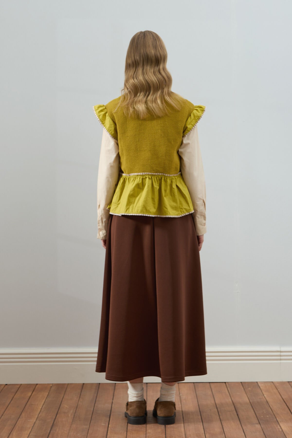 Yağ Yeşili Fırfırlı Triko Yelek & Acı Kahve Scuba Etek Takım
