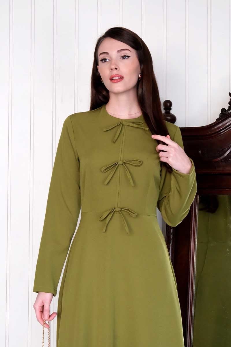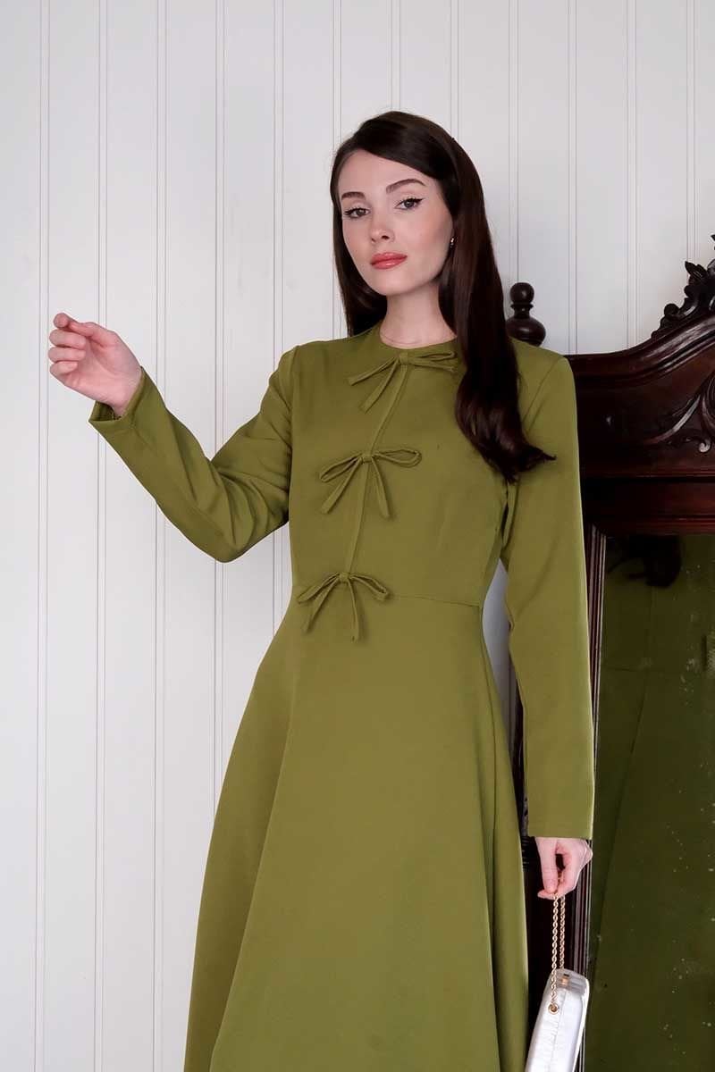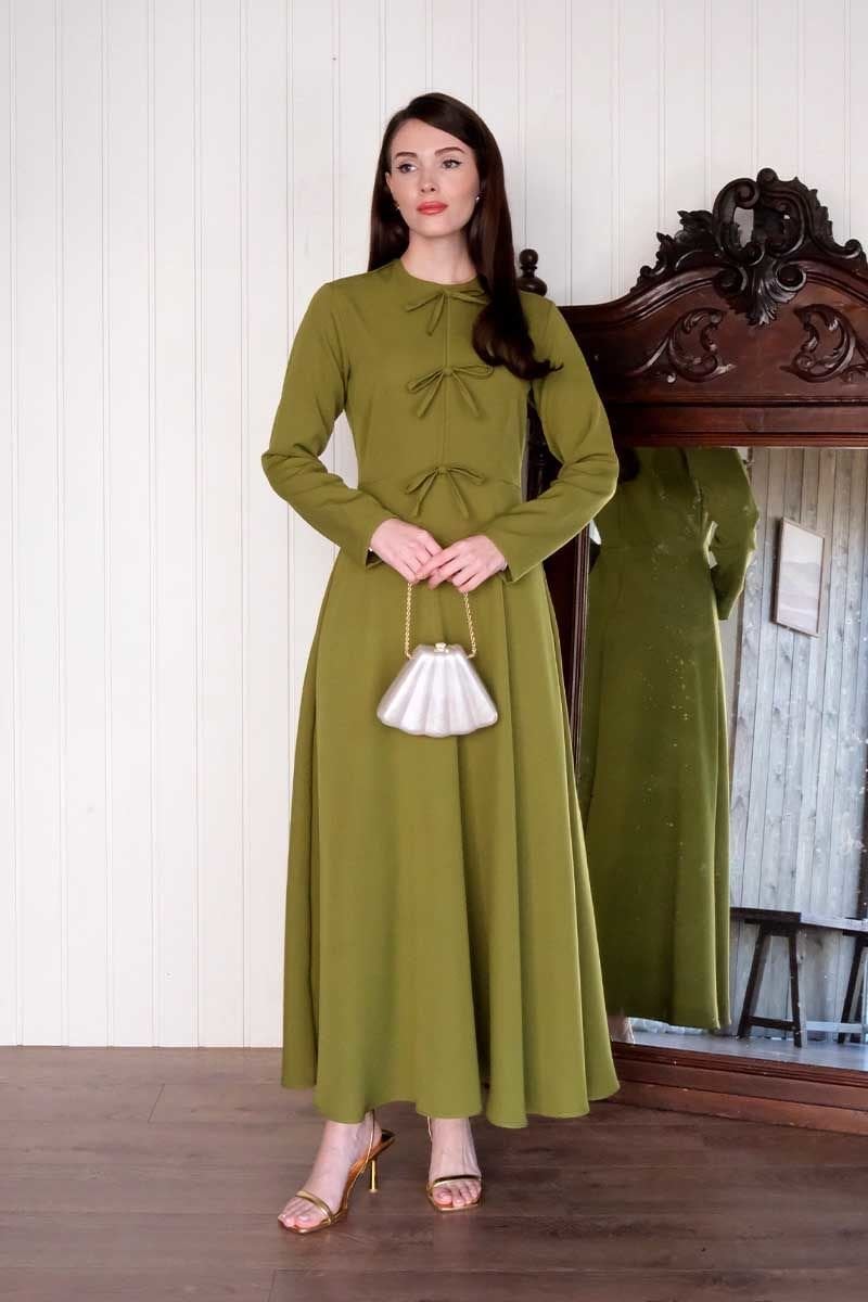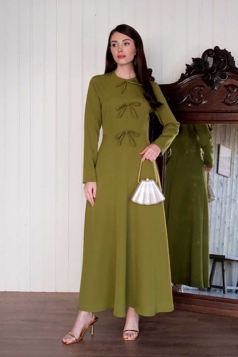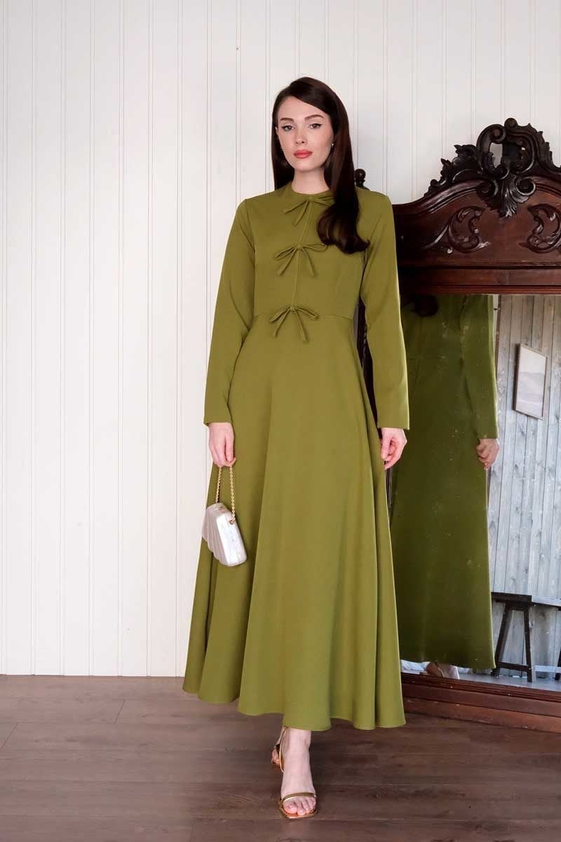 Yağ Yeşili Fiyonk Detay Krep Elbise