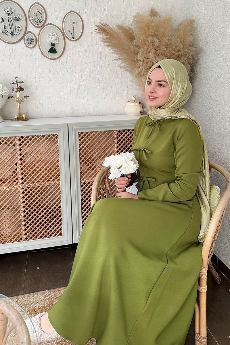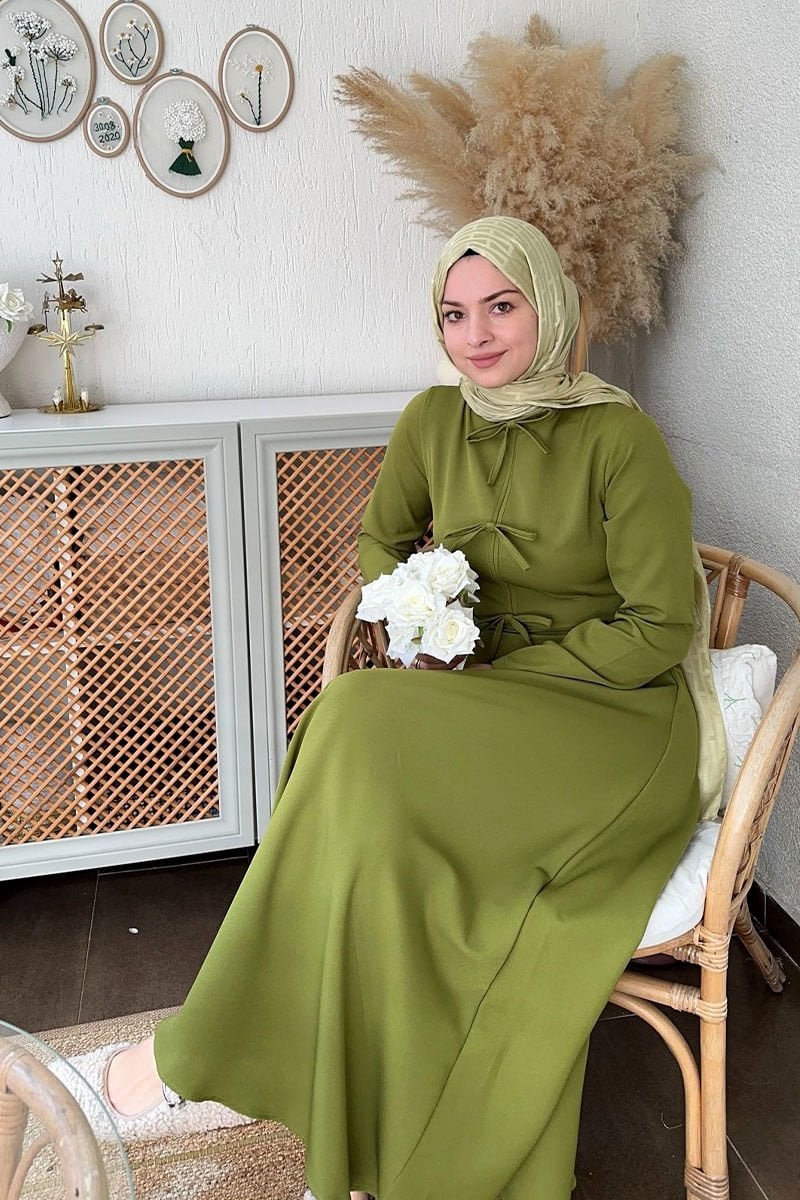 Yağ Yeşili Fiyonk Detay Krep Elbise / BÜŞRA
