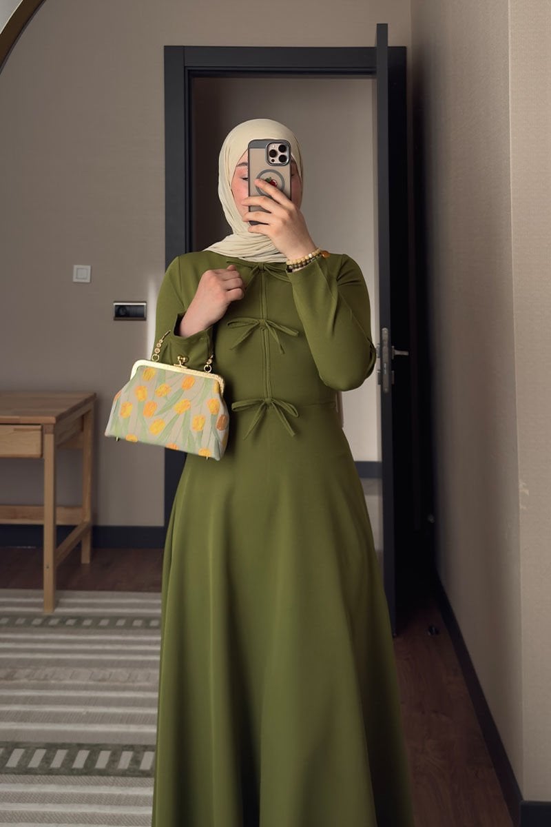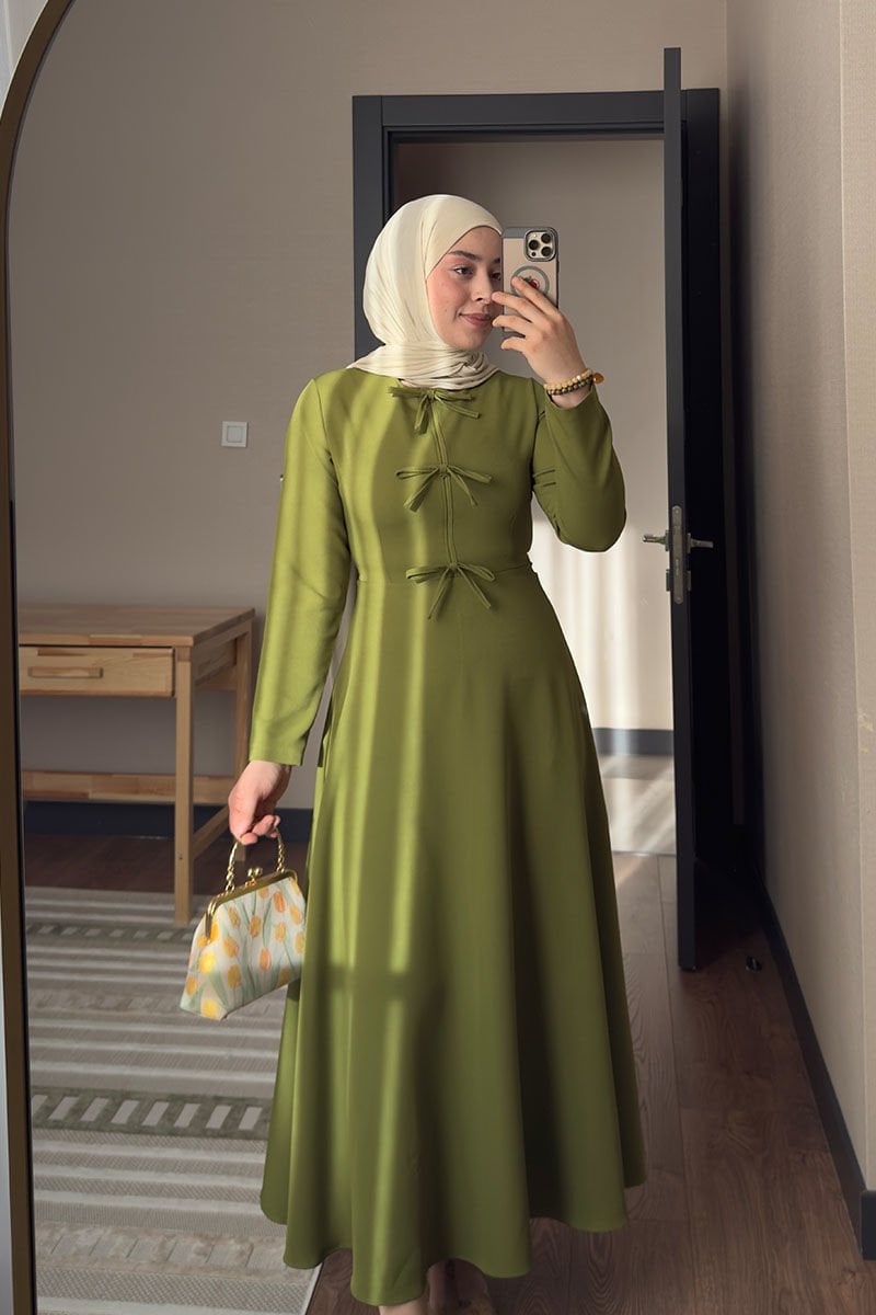 Yağ Yeşili Fiyonk Detay Krep Elbise / FADİKU
