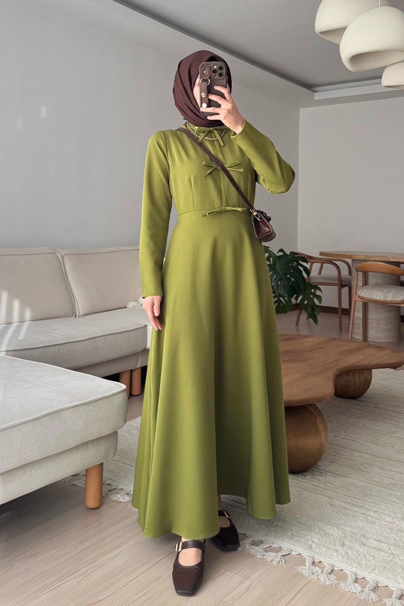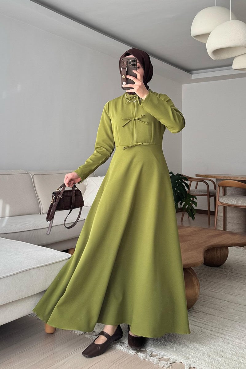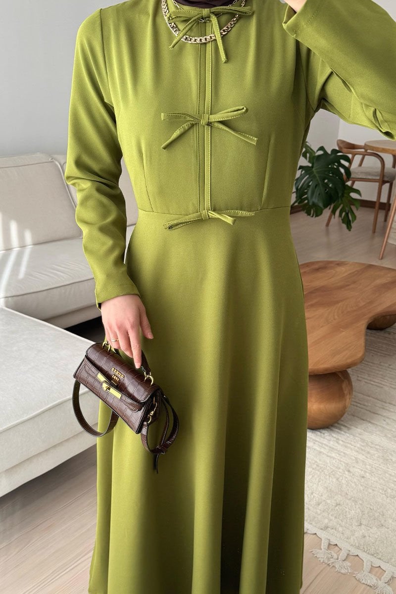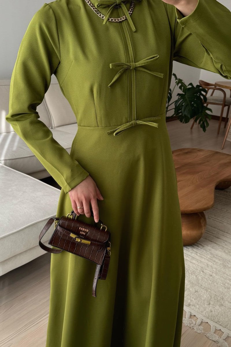 Yağ Yeşili Fiyonk Detay Krep Elbise / Sema Tektaş