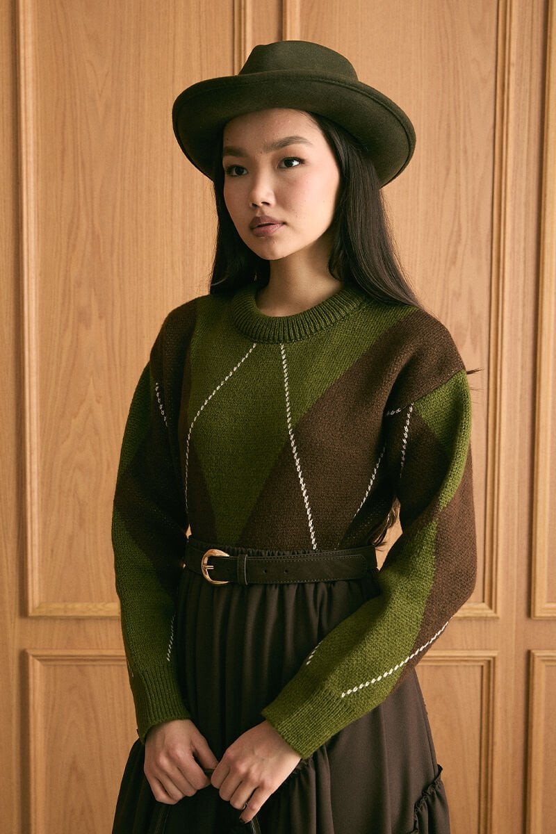 Zeytin Yeşili Baklava Desen Triko Kazak