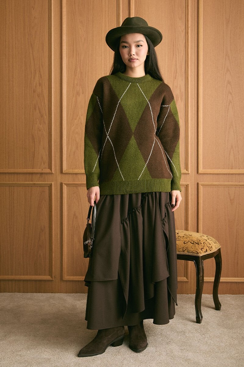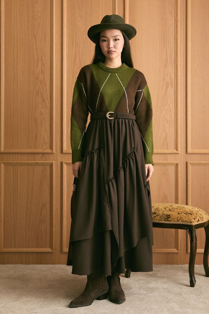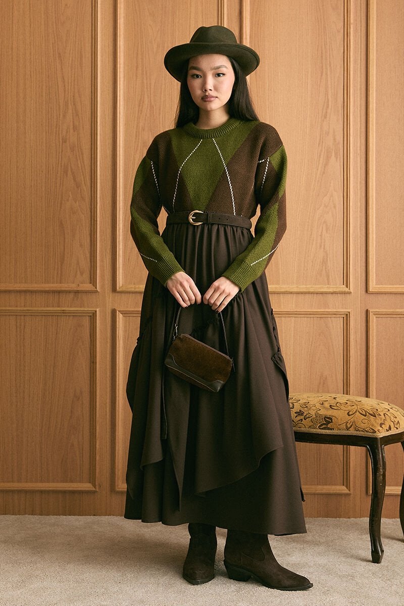 Zeytin Yeşili Baklava Desen Triko Kazak & Acı Kahve Poliviskon Bohem Kat Etek Takım