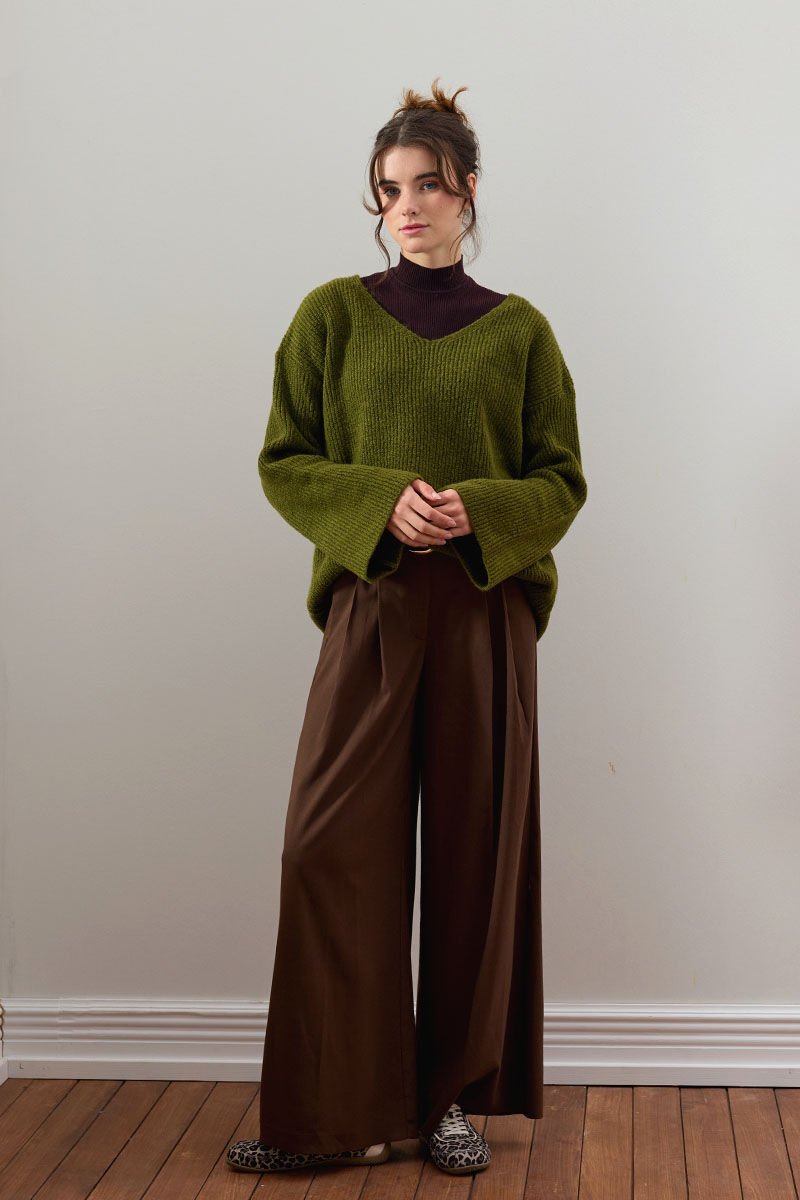 Zeytin Yeşili V Yaka Triko Kazak & Acı Kahve Pile Detay Palazzo Pantolon Takım