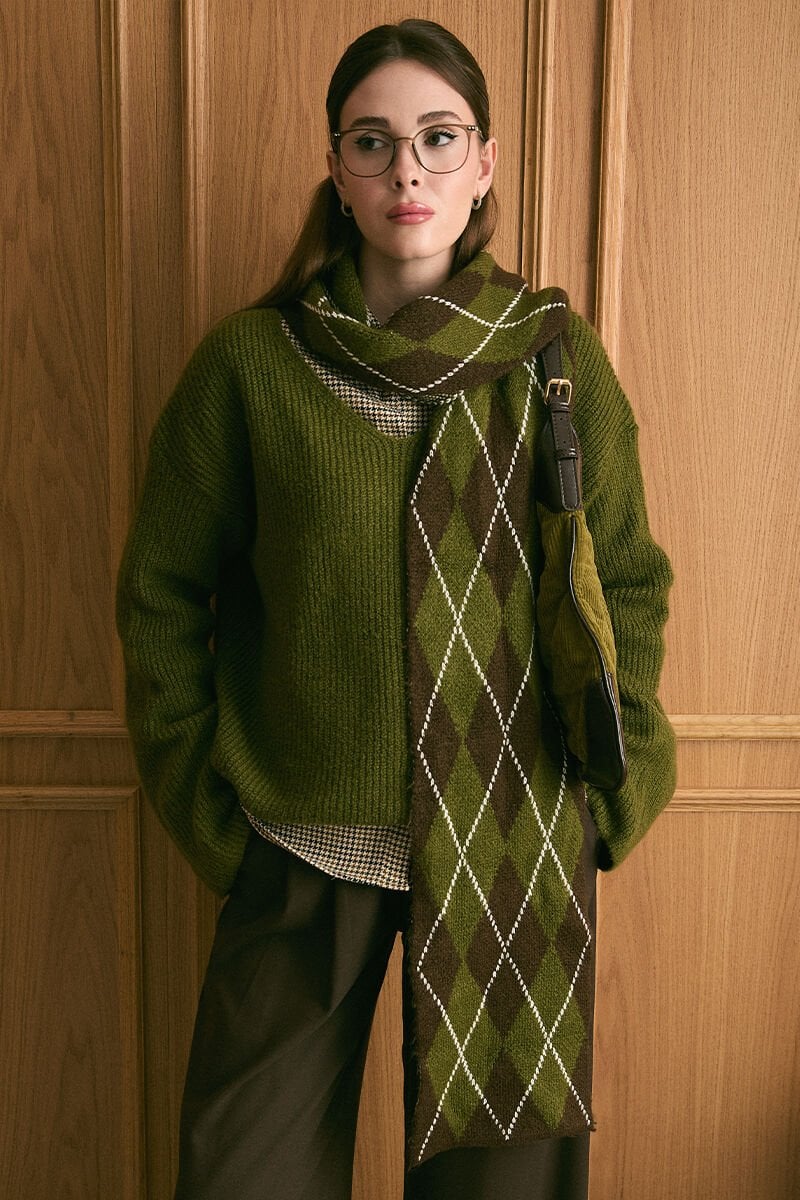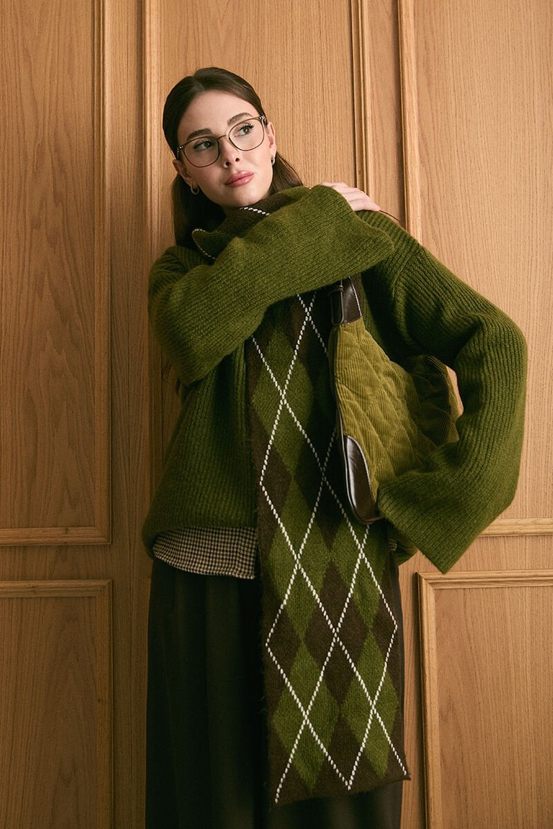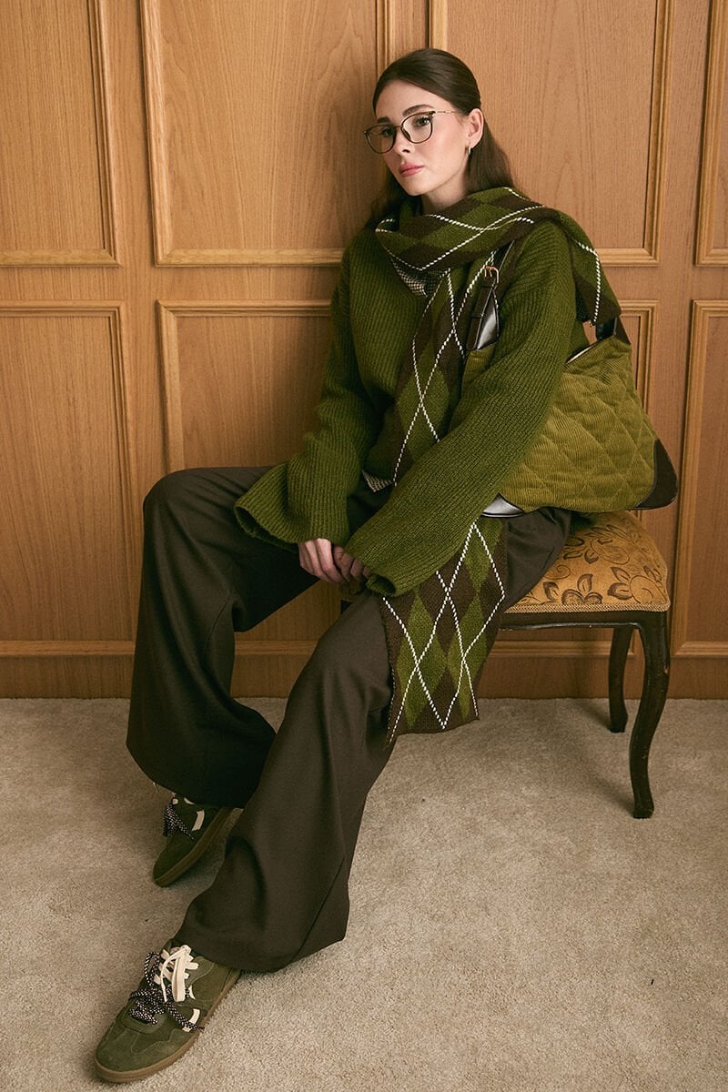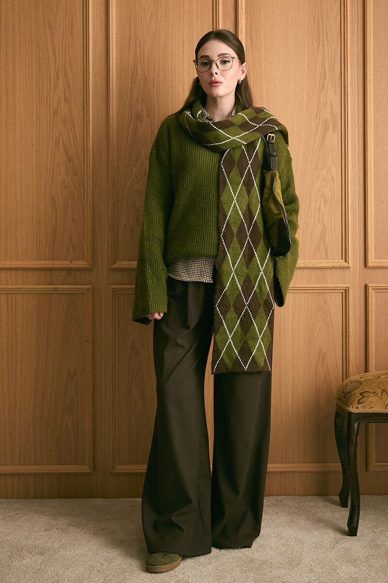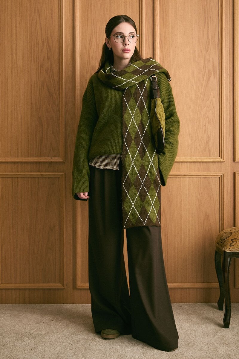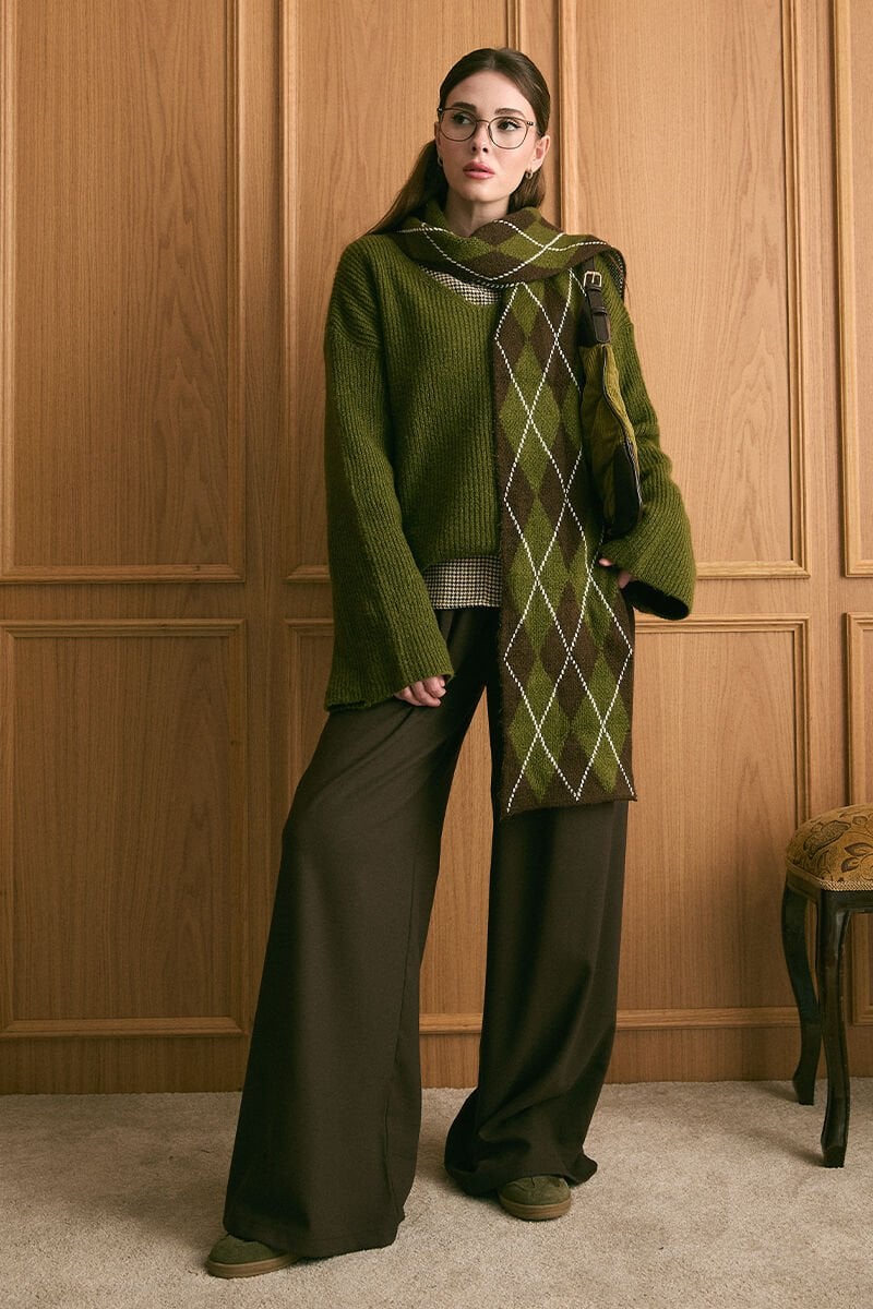 Zeytin Yeşili V Yaka Triko Kazak & Acı Kahve Pile Detay Palazzo Pantolon Takım