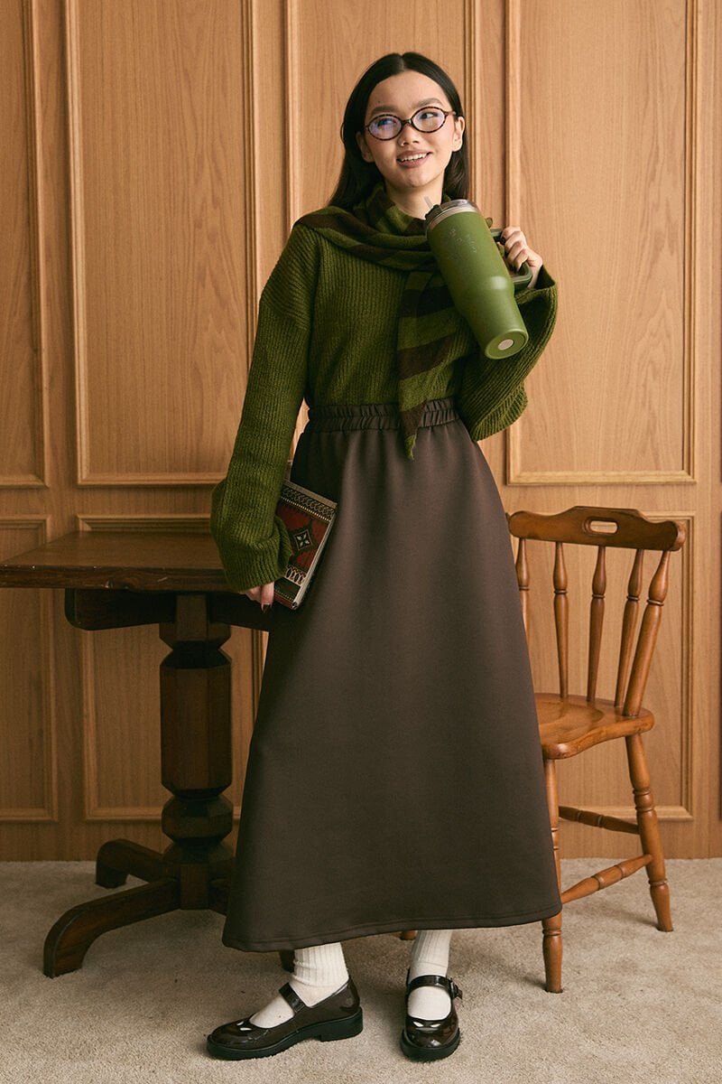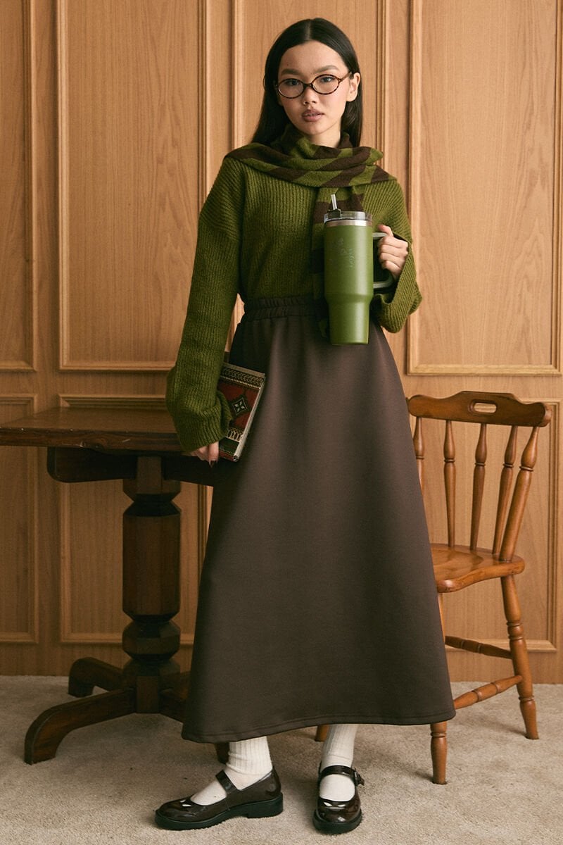 Zeytin Yeşili V Yaka Triko Kazak & Acı Kahve Scuba Etek Takım