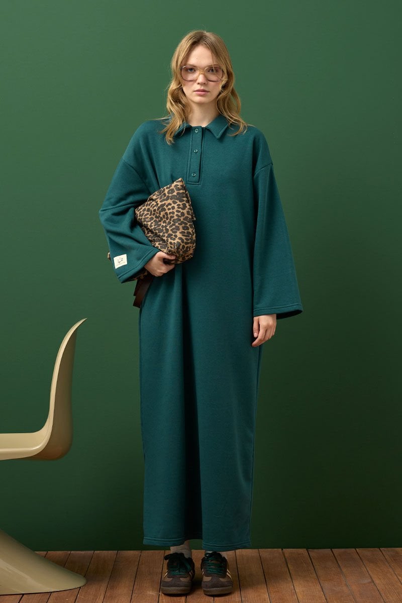 Bu şık ve rahat 3 iplik polo yaka uzun elbise, her an için harika bir seçenek.